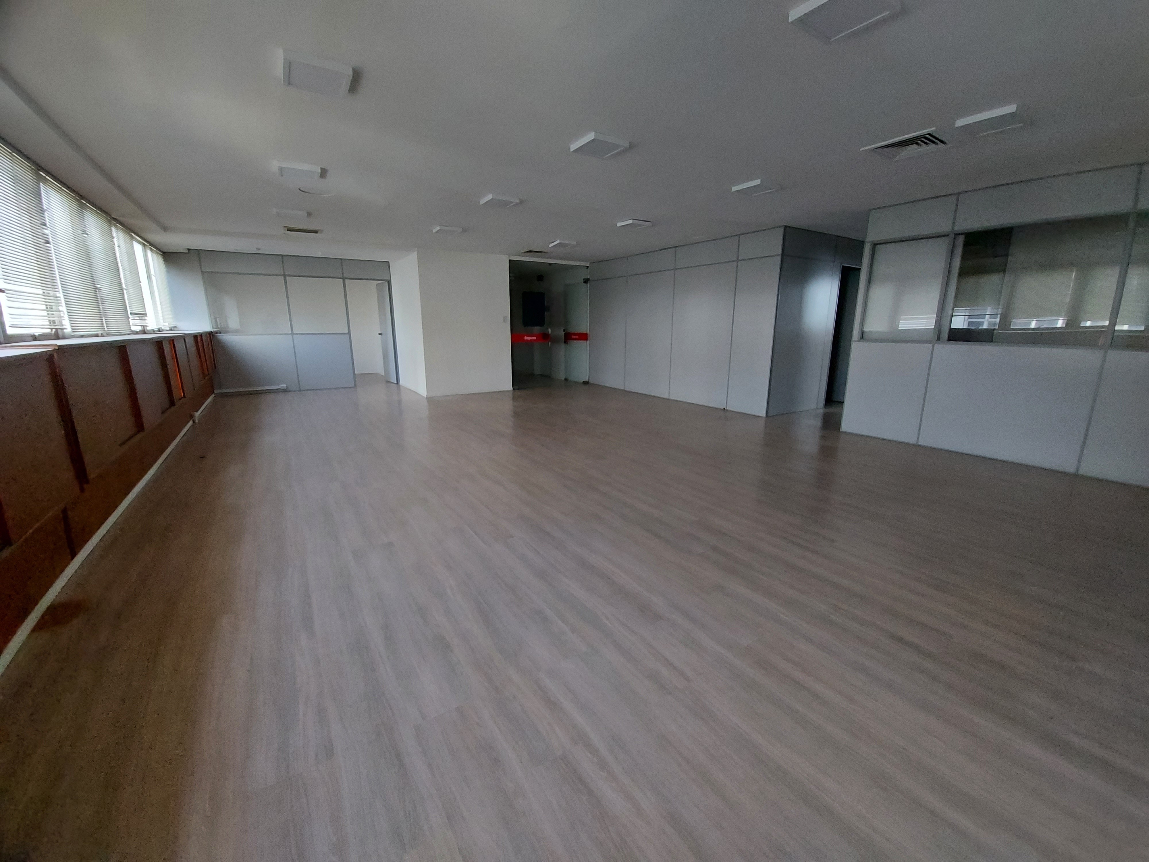 Sala comercial com 175m² de área útil. Divida em 01 salão amplo na entrada, com divisória para 01 sala ao lado da entrada, possui também mais 04 divisórias para salas, sendo uma com banheiro, a posição solar é leste e norte, possui piso laminado e ar condicionado central
